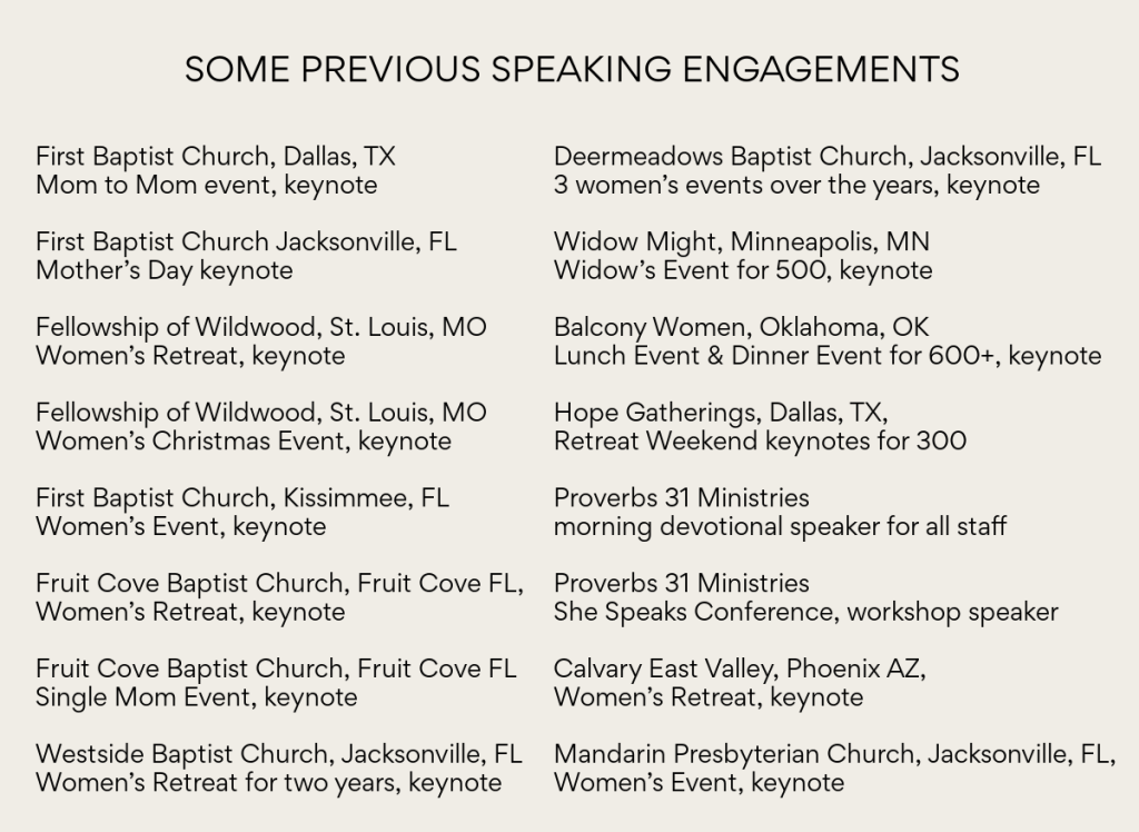 I speak to a wide variety of groups including women’s events in church and on retreat; mom groups; youth and schools; and homeschooling events. Click below to see some recent speaking events!