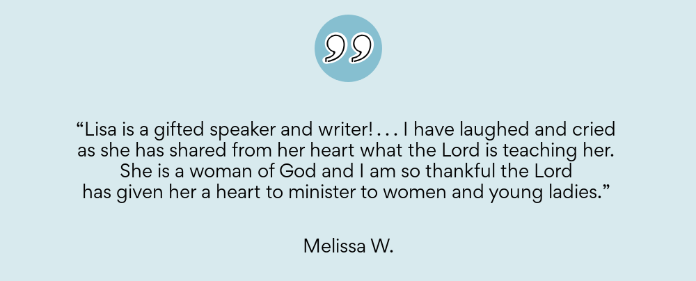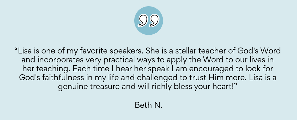 With an engaging mix of rich Bible teaching, heartwarming stories, and practical application, Lisa helps listeners deepen their faith through the storms of life and find hope in every season. Her passion for God’s Word and fervent compassion for others means attendees will experience compelling encouragement to trust the truth of scripture, to know God, and to love Him more.